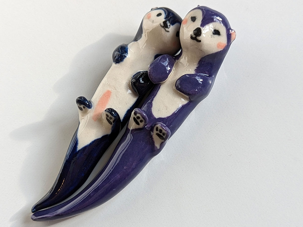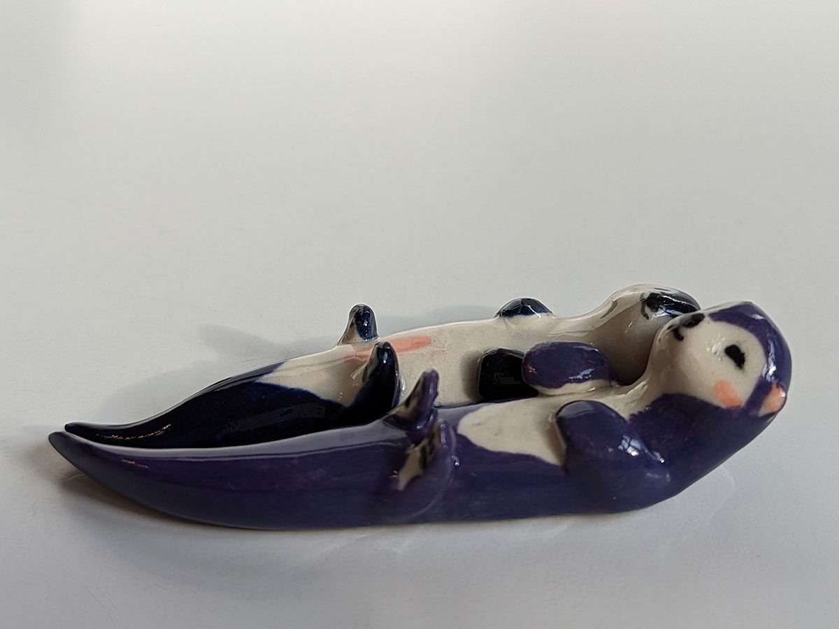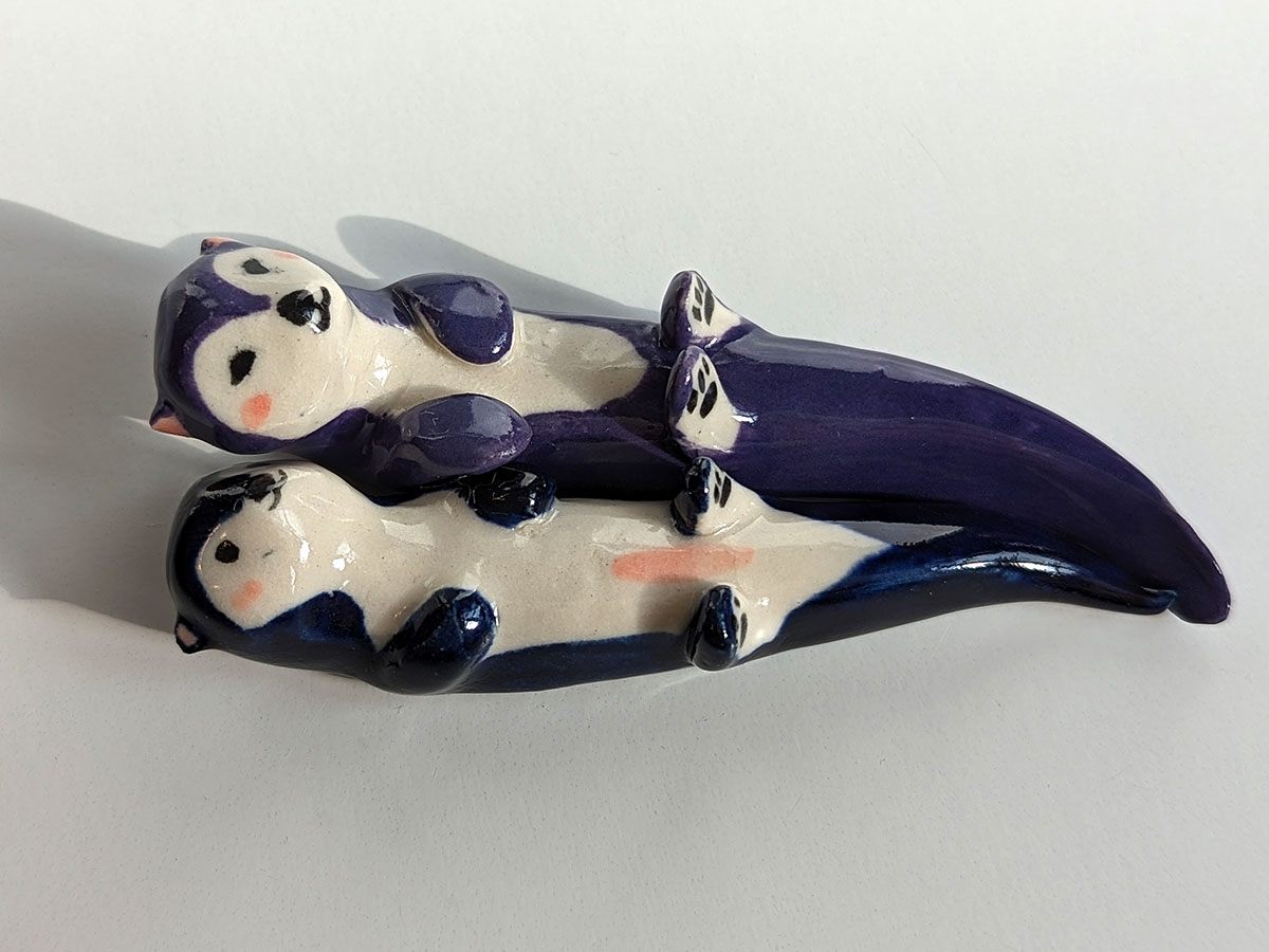 Deux petites loutres qui vont ensemble, le prix est pour les deux. Les loutres sont faites en porcelaine blanche, sculptées et peintes à la main. Chacune arrive dans sa boite illustrée, prête à offrir.