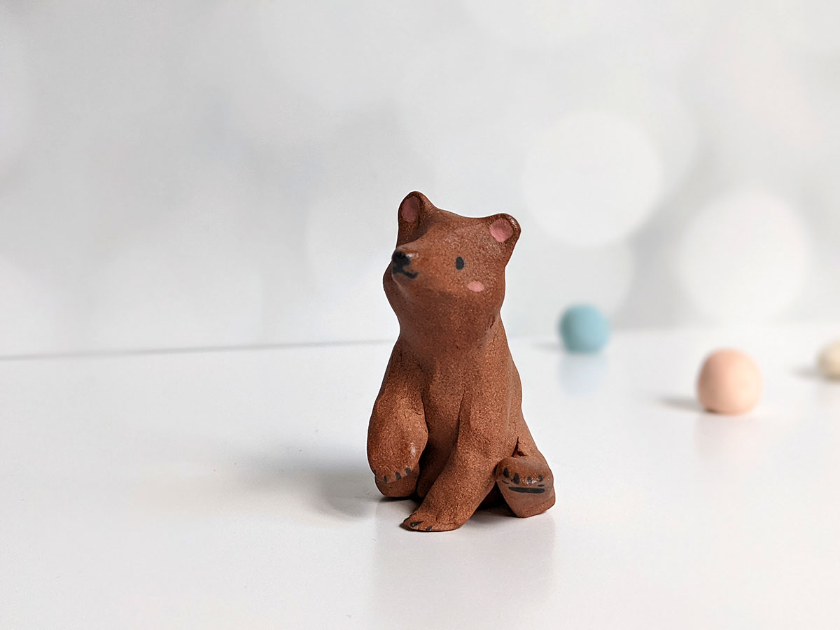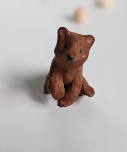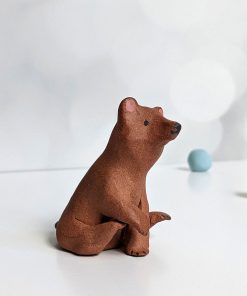Figurine d’ours brun sculpté à la main dans une argile rouge. Cette pièce n’est pas émaillée ce qui lui donne un aspect mat et un peu rugueux au toucher.