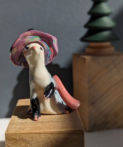 Figurine de Sorcière Opossum sculptée et peinte à la main dans mon studio de Montréal. Cette pièce unique est faite de porcelaine blanche décorée d’or 22k et de nacre.