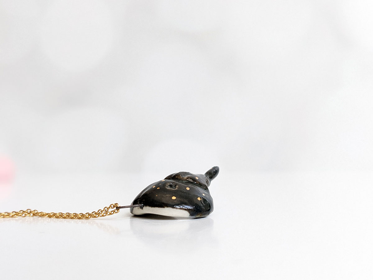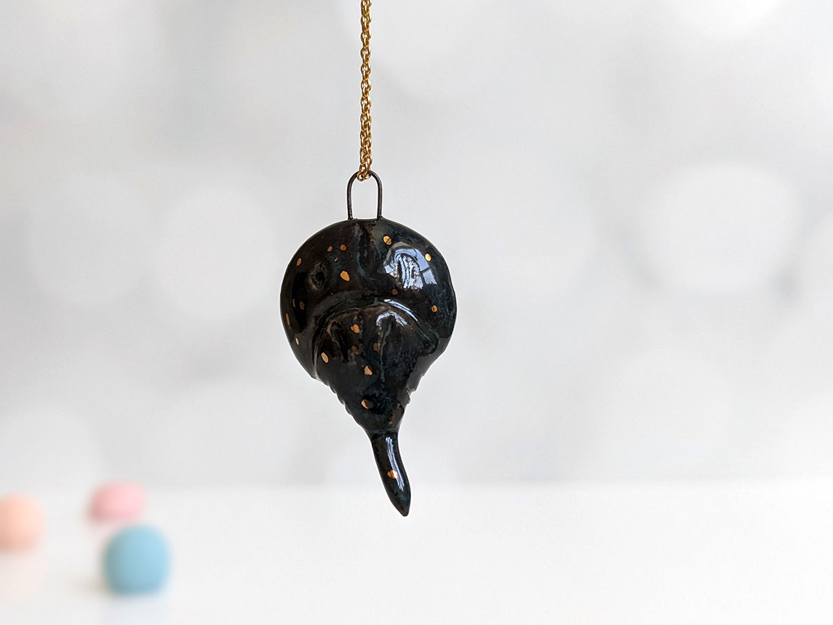 A horseshoe crab pendant in a starry night coat with gold stars. It has a cute smiley face underside. The truth is, horseshoe crabs have 10 eyes, but 2 was cuter.
