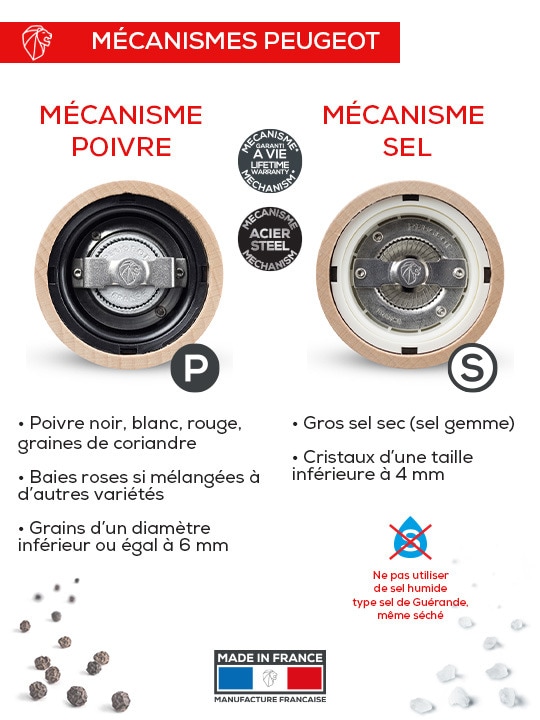 – Moulin à poivre : Pour moudre poivres noirs, blancs, verts ou rouges, baies roses (15% maxi dans un mélange de poivre) et graines de coriandre